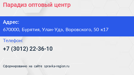Парадиз, оптовый центр по адресу 670000, Бурятия, Улан-Удэ, Воровского, 50 к17 в дальнейшем Организация, размещена в следующих категориях: