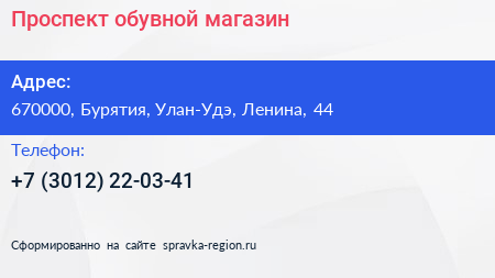Проспект, обувной магазин по адресу 670000, Бурятия, Улан-Удэ, Ленина, 44 в дальнейшем Организация, размещена в следующих категориях: