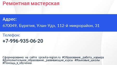 Ремонтная мастерская по адресу 670049, Бурятия, Улан-Удэ, 112-й микрорайон, 31 в дальнейшем Организация, размещена в следующих категориях: