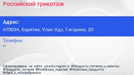 Российский трикотаж по адресу 670034, Бурятия, Улан-Удэ, Гагарина, 20 в дальнейшем Организация, размещена в следующих категориях: