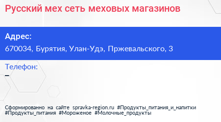 Русский мех, сеть меховых магазинов по адресу 670034, Бурятия, Улан-Удэ, Пржевальского, 3 в дальнейшем Организация, размещена в следующих категориях: