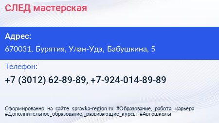 СЛЕД, мастерская по адресу 670031, Бурятия, Улан-Удэ, Бабушкина, 5 в дальнейшем Организация, размещена в следующих категориях: