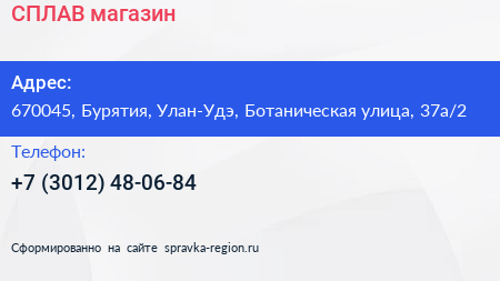 СПЛАВ, магазин по адресу 670045, Бурятия, Улан-Удэ, Ботаническая улица, 37а/2 в дальнейшем Организация, размещена в следующих категориях: