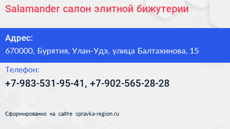 Salamander, салон элитной бижутерии по адресу 670000, Бурятия, Улан-Удэ, улица Балтахинова, 15 в дальнейшем Организация, размещена в следующих категориях: