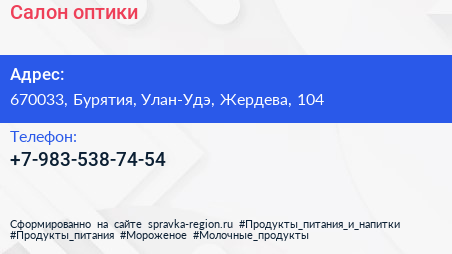 Салон оптики по адресу 670033, Бурятия, Улан-Удэ, Жердева, 104 в дальнейшем Организация, размещена в следующих категориях: