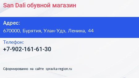 San-Dali, обувной магазин по адресу 670000, Бурятия, Улан-Удэ, Ленина, 44 в дальнейшем Организация, размещена в следующих категориях: