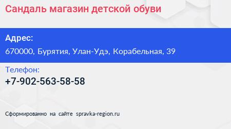 Сандаль, магазин детской обуви по адресу 670000, Бурятия, Улан-Удэ, Корабельная, 39 в дальнейшем Организация, размещена в следующих категориях: