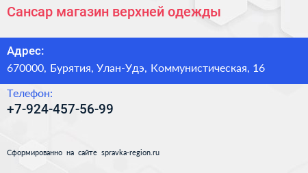 Сансар, магазин верхней одежды по адресу 670000, Бурятия, Улан-Удэ, Коммунистическая, 16 в дальнейшем Организация, размещена в следующих категориях: