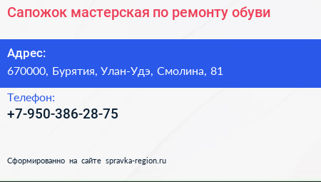 Сапожок, мастерская по ремонту обуви по адресу 670000, Бурятия, Улан-Удэ, Смолина, 81 в дальнейшем Организация, размещена в следующих категориях: