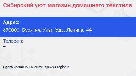 Сибирский уют, магазин домашнего текстиля по адресу 670000, Бурятия, Улан-Удэ, Ленина, 44 в дальнейшем Организация, размещена в следующих категориях: