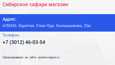 Сибирское сафари, магазин по адресу 670042, Бурятия, Улан-Удэ, Калашникова, 10а в дальнейшем Организация, размещена в следующих категориях: