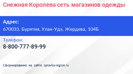 Снежная Королева, сеть магазинов одежды по адресу 670033, Бурятия, Улан-Удэ, Жердева, 104Б в дальнейшем Организация, размещена в следующих категориях: