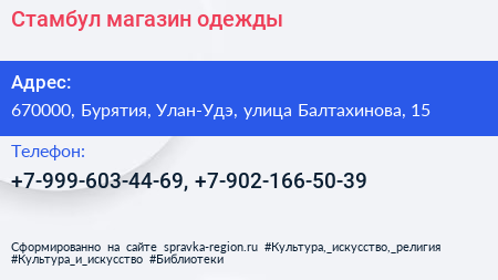 Стамбул, магазин одежды по адресу 670000, Бурятия, Улан-Удэ, улица Балтахинова, 15 в дальнейшем Организация, размещена в следующих категориях: