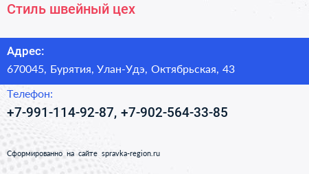Стиль, швейный цех по адресу 670045, Бурятия, Улан-Удэ, Октябрьская, 43 в дальнейшем Организация, размещена в следующих категориях: