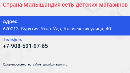Страна Малышандия, сеть детских магазинов по адресу 670013, Бурятия, Улан-Удэ, Ключевская улица, 40 в дальнейшем Организация, размещена в следующих категориях: