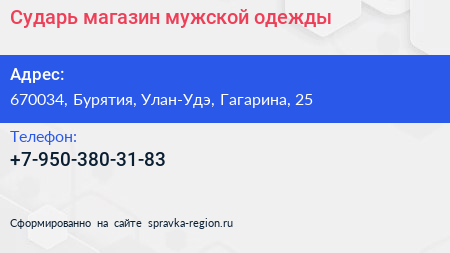 Сударь, магазин мужской одежды по адресу 670034, Бурятия, Улан-Удэ, Гагарина, 25 в дальнейшем Организация, размещена в следующих категориях: