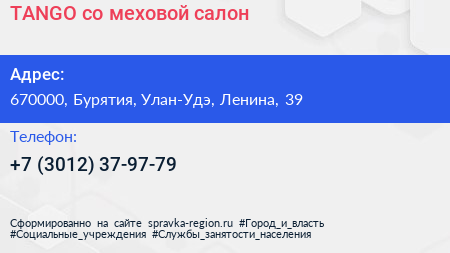 TANGO & co, меховой салон по адресу 670000, Бурятия, Улан-Удэ, Ленина, 39 в дальнейшем Организация, размещена в следующих категориях: