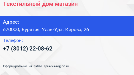 Текстильный дом, магазин по адресу 670000, Бурятия, Улан-Удэ, Кирова, 26 в дальнейшем Организация, размещена в следующих категориях: