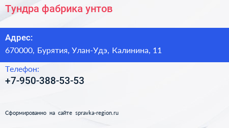 Тундра, фабрика унтов по адресу 670000, Бурятия, Улан-Удэ, Калинина, 11 в дальнейшем Организация, размещена в следующих категориях: