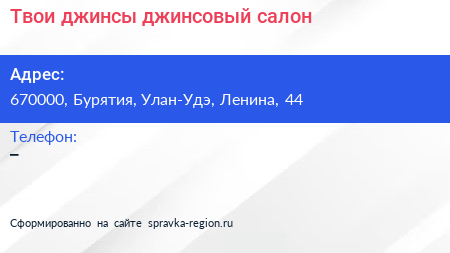 Твои джинсы, джинсовый салон по адресу 670000, Бурятия, Улан-Удэ, Ленина, 44 в дальнейшем Организация, размещена в следующих категориях: