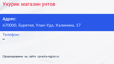 Укурик, магазин унтов по адресу 670000, Бурятия, Улан-Удэ, Калинина, 17 в дальнейшем Организация, размещена в следующих категориях: