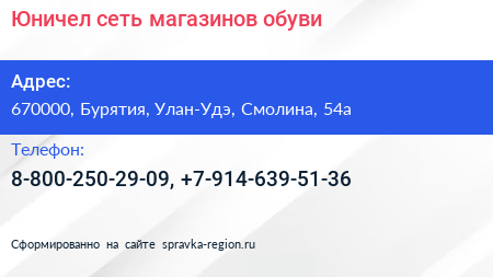 Юничел, сеть магазинов обуви по адресу 670000, Бурятия, Улан-Удэ, Смолина, 54а в дальнейшем Организация, размещена в следующих категориях: