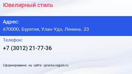 Ювелирный стиль по адресу 670000, Бурятия, Улан-Удэ, Ленина, 23 в дальнейшем Организация, размещена в следующих категориях: