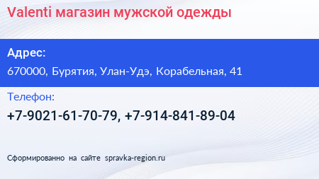 Valenti, магазин мужской одежды по адресу 670000, Бурятия, Улан-Удэ, Корабельная, 41 в дальнейшем Организация, размещена в следующих категориях: