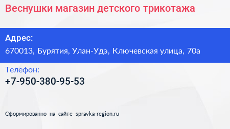Веснушки, магазин детского трикотажа по адресу 670013, Бурятия, Улан-Удэ, Ключевская улица, 70а в дальнейшем Организация, размещена в следующих категориях: