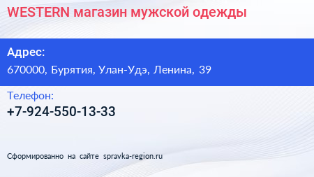 WESTERN, магазин мужской одежды по адресу 670000, Бурятия, Улан-Удэ, Ленина, 39 в дальнейшем Организация, размещена в следующих категориях: