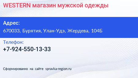 WESTERN, магазин мужской одежды по адресу 670033, Бурятия, Улан-Удэ, Жердева, 104Б в дальнейшем Организация, размещена в следующих категориях: