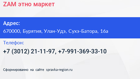 ZAM, этно-маркет по адресу 670000, Бурятия, Улан-Удэ, Сухэ-Батора, 16а в дальнейшем Организация, размещена в следующих категориях:
