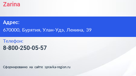 Zarina по адресу 670000, Бурятия, Улан-Удэ, Ленина, 39 в дальнейшем Организация, размещена в следующих категориях: