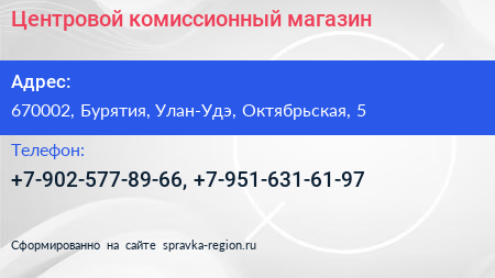 Центровой, комиссионный магазин по адресу 670002, Бурятия, Улан-Удэ, Октябрьская, 5 в дальнейшем Организация, размещена в следующих категориях:
