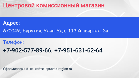 Центровой, комиссионный магазин по адресу 670049, Бурятия, Улан-Удэ, 113-й квартал, 3а в дальнейшем Организация, размещена в следующих категориях: