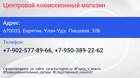 Центровой, комиссионный магазин по адресу 670033, Бурятия, Улан-Удэ, Пищевая, 10Б в дальнейшем Организация, размещена в следующих категориях: