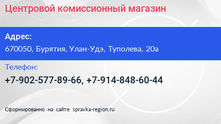 Центровой, комиссионный магазин по адресу 670050, Бурятия, Улан-Удэ, Туполева, 20а в дальнейшем Организация, размещена в следующих категориях: