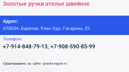 Золотые ручки, ателье швейное по адресу 670034, Бурятия, Улан-Удэ, Гагарина, 25 в дальнейшем Организация, размещена в следующих категориях: