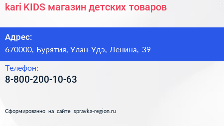 kari KIDS, магазин детских товаров по адресу 670000, Бурятия, Улан-Удэ, Ленина, 39 в дальнейшем Организация, размещена в следующих категориях: