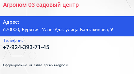 Агроном 03, садовый центр по адресу 670000, Бурятия, Улан-Удэ, улица Балтахинова, 9 в дальнейшем Организация, размещена в следующих категориях: