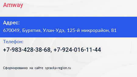 Amway по адресу 670049, Бурятия, Улан-Удэ, 125-й микрорайон, 81 в дальнейшем Организация, размещена в следующих категориях: