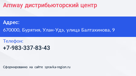Amway, дистрибьюторский центр по адресу 670000, Бурятия, Улан-Удэ, улица Балтахинова, 9 в дальнейшем Организация, размещена в следующих категориях: