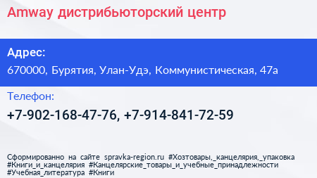 Amway, дистрибьюторский центр по адресу 670000, Бурятия, Улан-Удэ, Коммунистическая, 47а в дальнейшем Организация, размещена в следующих категориях: