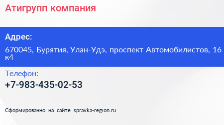 Атигрупп, компания по адресу 670045, Бурятия, Улан-Удэ, проспект Автомобилистов, 16 к4 в дальнейшем Организация, размещена в следующих категориях:
