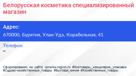 Белорусская косметика, специализированный магазин по адресу 670000, Бурятия, Улан-Удэ, Корабельная, 41 в дальнейшем Организация, размещена в следующих категориях: