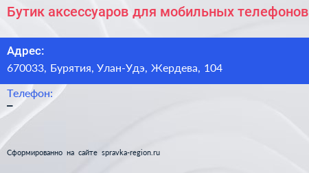 Бутик аксессуаров для мобильных телефонов по адресу 670033, Бурятия, Улан-Удэ, Жердева, 104 в дальнейшем Организация, размещена в следующих категориях: