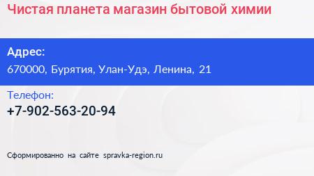 Чистая планета, магазин бытовой химии по адресу 670000, Бурятия, Улан-Удэ, Ленина, 21 в дальнейшем Организация, размещена в следующих категориях: