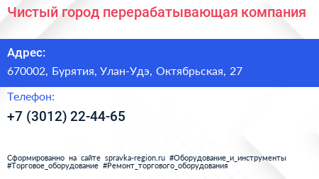 Чистый город, перерабатывающая компания по адресу 670002, Бурятия, Улан-Удэ, Октябрьская, 27 в дальнейшем Организация, размещена в следующих категориях: