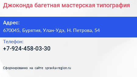 Джоконда, багетная мастерская-типография по адресу 670045, Бурятия, Улан-Удэ, Н. Петрова, 54 в дальнейшем Организация, размещена в следующих категориях: