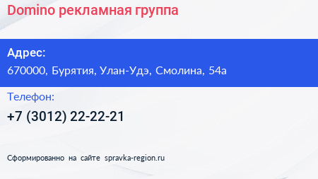Domino, рекламная группа по адресу 670000, Бурятия, Улан-Удэ, Смолина, 54а в дальнейшем Организация, размещена в следующих категориях: